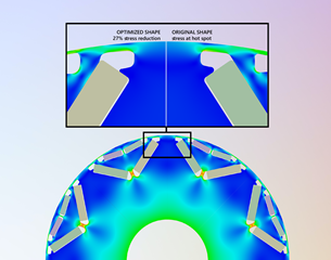 Image 3 (right): Electric Engine: Optimal performance of electric motors is required to ensure both maximum power efficiency and structural reliability in transportation applications. Here, Ansys Maxwell, Ansys Mechanical, and Ansys RBF Morph Structures are being applied to optimize performance and durability. The parameter-free shape optimizer of RBF Morph allows for the reshaping of the most stressed pocket, resulting in a 27% reduction in stress.